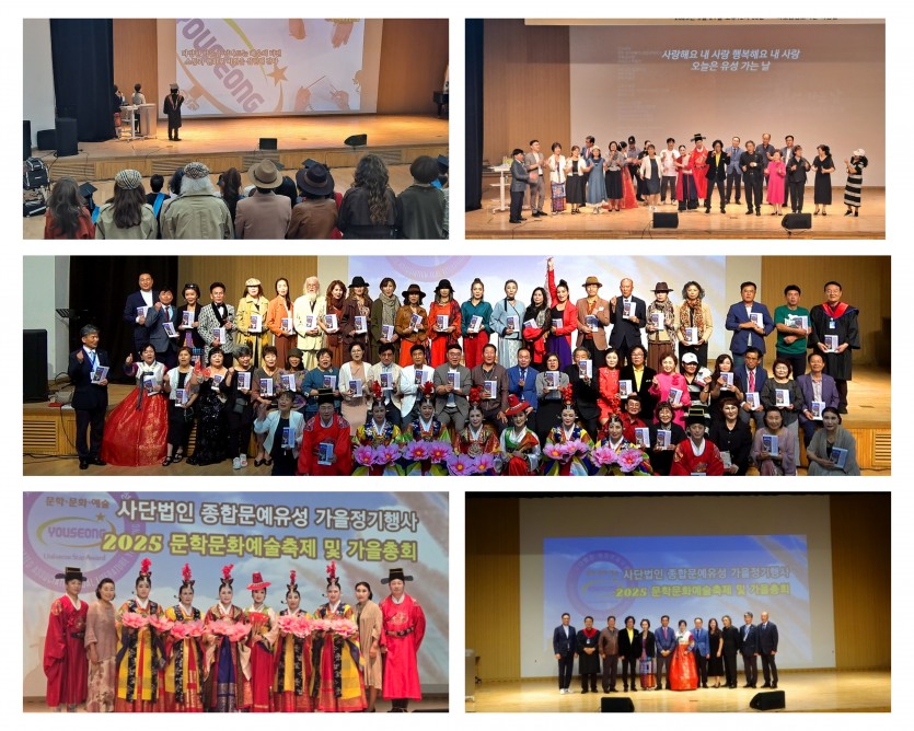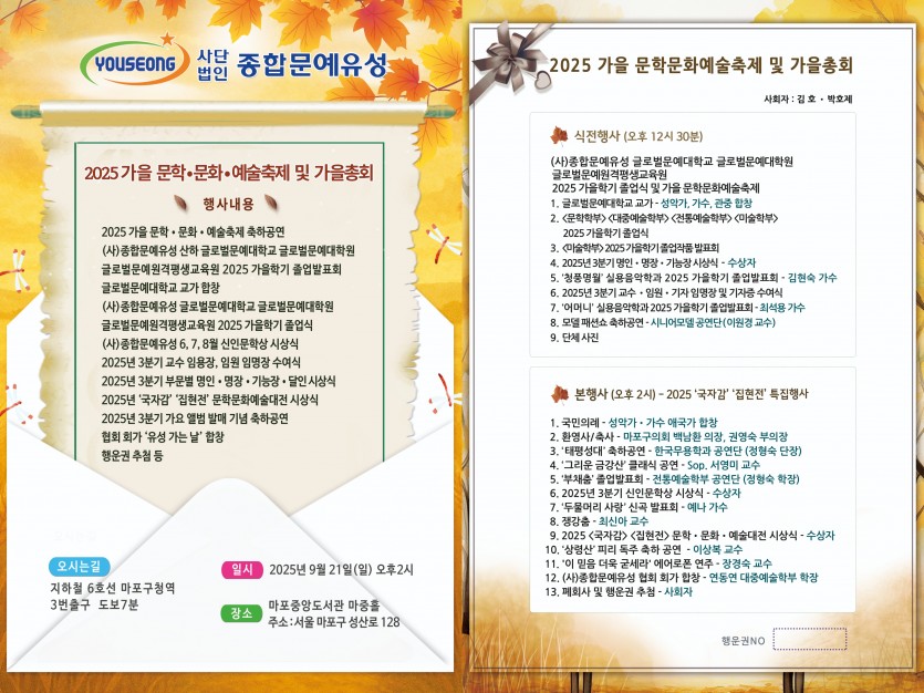 9월 21일, 마포중앙도서관 마중홀에서 (사)종합문예유성 2025 가을 문학문화예술축제 및 가을총회(가을학기 졸업식)을 매우 버라이어티하고 성대하게 개최하였습니다. 박호제 교수 MC, 김 호 MC 님의 퍼펙트한 명사회와 전국에서 달려와주신 공익법인 (사)종합문예유성 글로벌문예협회 임원님•회원님, 글로벌문예대학교 대학원 교수님과 학우님의 노고와 협력으로 사단법인 종합문예유성 글로벌문예협회 2025 가을 문학문화예술 대축제 및 가을총회(글로벌문예대 2025 가을학기 졸업식)을 매우 성공적으로 잘 마쳤습니다.