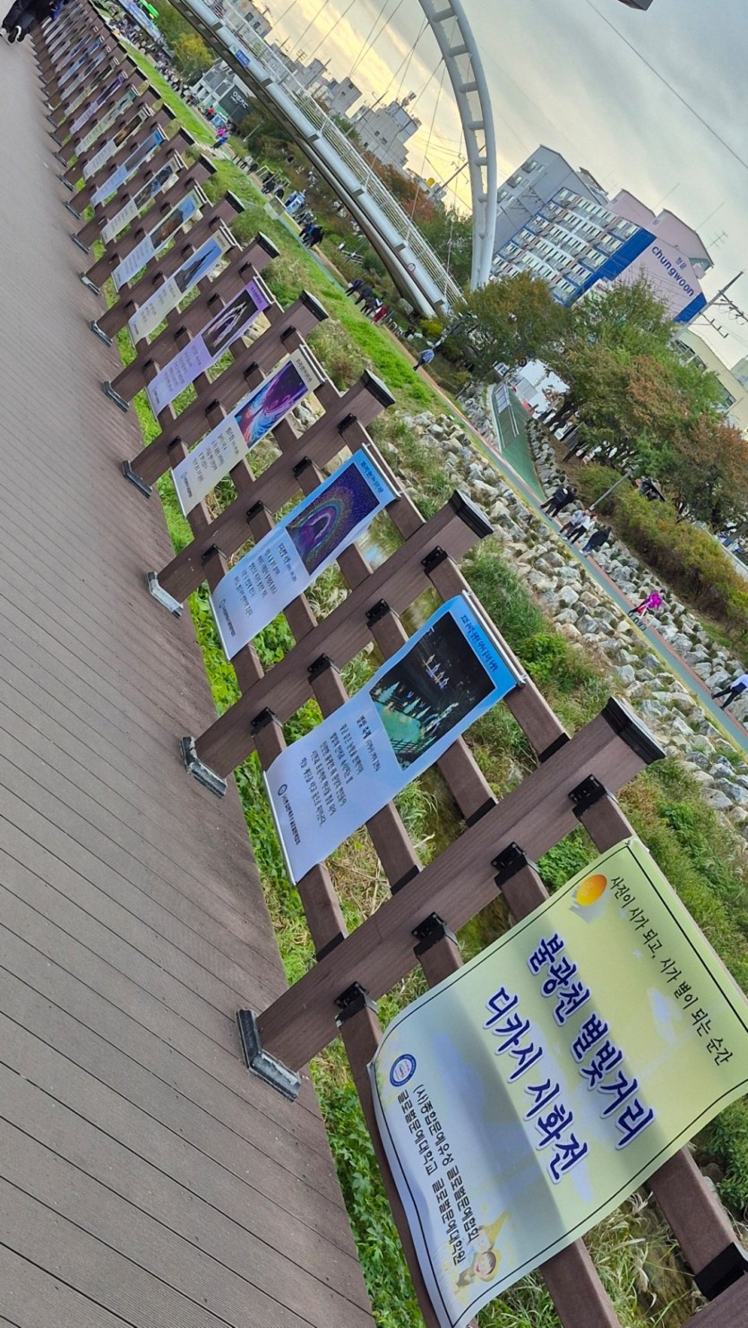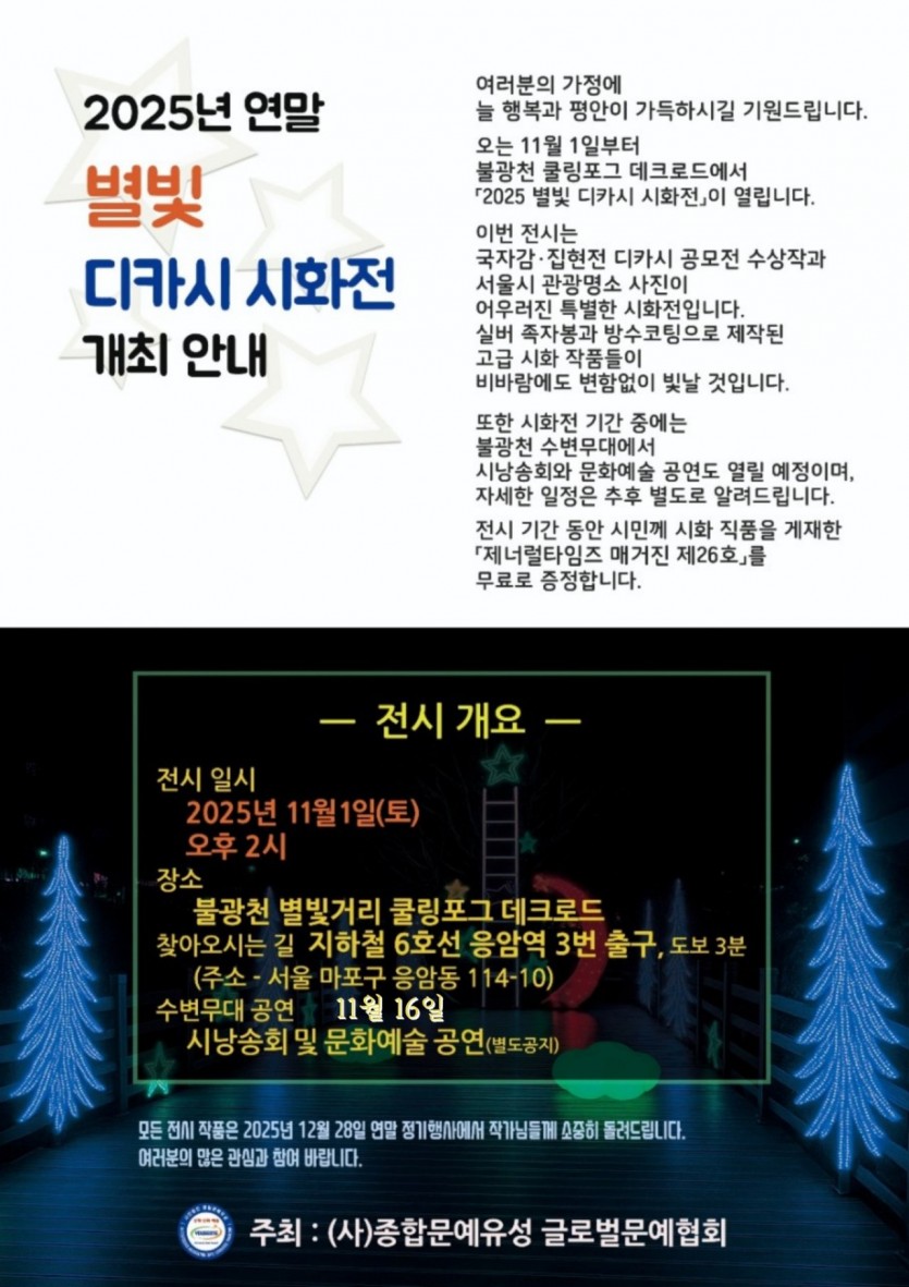 드디어 11월 1일부터, 서울특별시 은평구 불광천 쿨링포그 데크로드에서 (사)종합문예유성 글로벌문예협회, 글로벌문예대학교 대학원, 글로벌문예원격평생교육원이 주관하는 특별한 디카시 예술 축제, <2025 연말 불광천 별빛 디카시 시화전>이 화려하게 막을 올렸습니다.