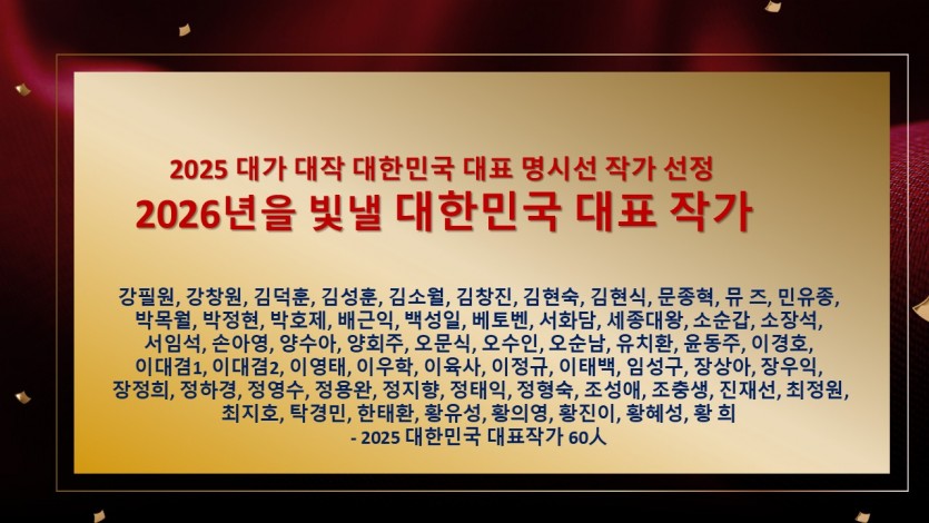 대한민국 특허청 상표 등록 기념 특집 "2025 대가 대작 대한민국 대표 명시선 작가를 최종 선정하여 발표합니다. 2025 겨울 문학문화예술 축제 및 연말총회(2025 겨울 정기행사) 출판기념회에서 "2025 대가대작 대한민국 대표 명시선 선정, 2025 대한민국 대표 작가 인증서"를 수여합니다(*2025 겨울 정기행사 참석자에 한함).